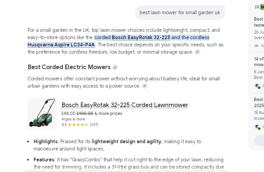 Insight: Brands increasingly benefit from being referenced in AI responses, not just clicked. In the above example – Bosch EasyRotak model dominates the AI Search query -‘ best lawn mower for small garden UK’. The new search competition is to make sure your brand or product appear first here. Users are trusting more and more AI answer and this can lead to high conversation rates.