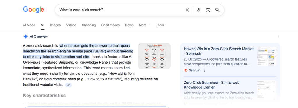 For example, if a user searches “What is zero-click search?”, Google may display a concise explanation at the top that answers the question immediately – eliminating the need to click any link